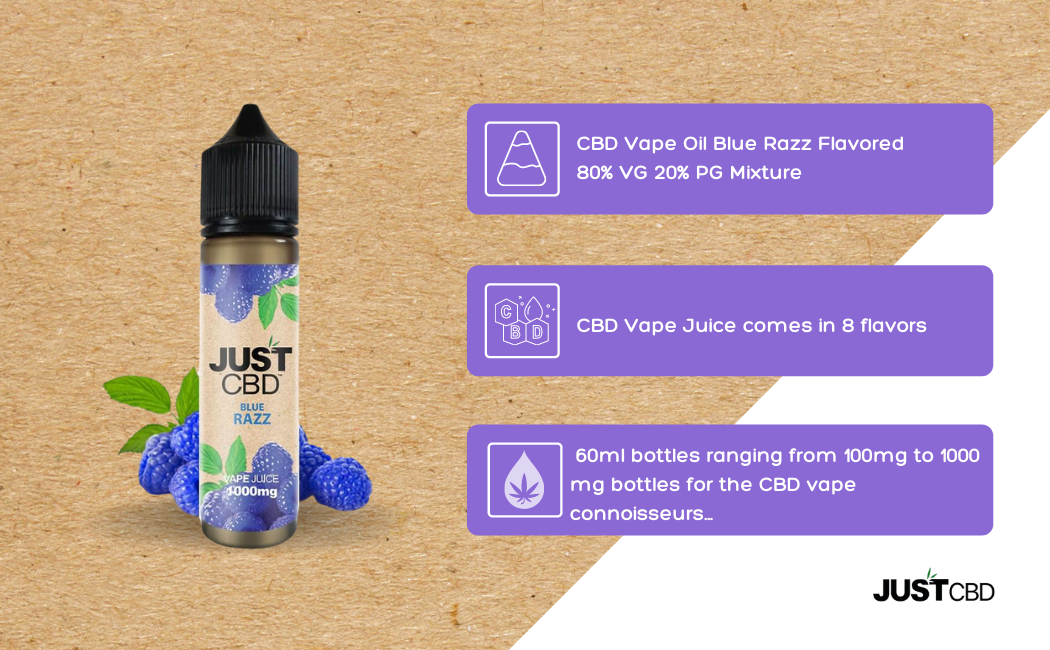 Our distinctive Blue Razz flavor is not to be missed. Enjoy a burst of both blueberries and raspberries, with a cooling sensation on the exhale. Of course, this is followed by an instantly soothing feeling of relaxation and zen from our premium and potent CBD. If you’re looking for something not overly fruity but with a distinctive and refined taste, Blue Razz is for you. Blue Razz comes in convenient 60ml bottles, and we offer different strengths of 100mg of CBD, 250mg of CBD, 500mg of CBD, or 1000mg of CB, which is our most potent oil. JustCBD Blue Razz Vape Oil does not contain any tobacco and is made from only the purest of ingredients, just like all of our products at JustCBD. Remember, JustCBD Vape Oils are only for use in vaporizers, and not intended for ingestion.