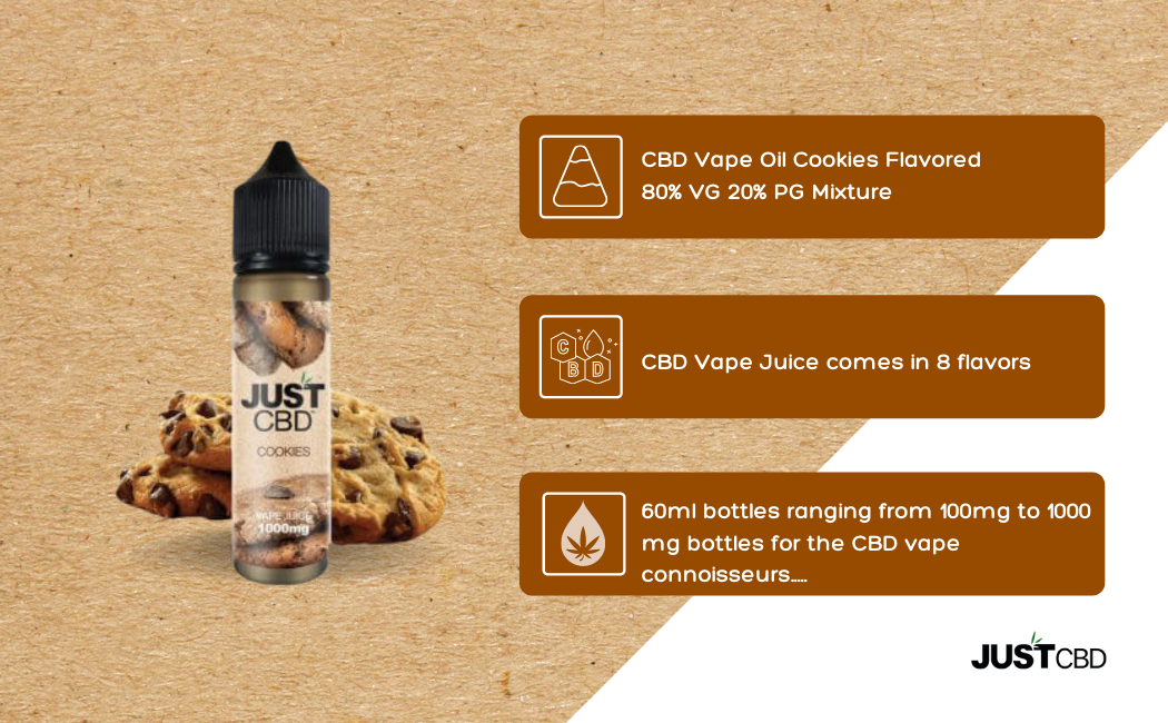 Think of your favorite Girl Scout Cookie (tagalongs for us!) infused with the calming and warming effects of our exceptional CBD. JustCBD Cookies Vape Oil will remind you of your go-to addicting snack, but with none of the guilt and all of the pleasure. So don’t hesitate, and see why our uniquely sweet and decadent Cookies Vape Oil is a customer favorite. JustCBD Cookies Vape Oil comes in convenient 60ml bottles, and we offer different strengths of 100mg of CBD, 250mg of CBD, 500mg of CBD, or 1000mg of CBD, which is our most potent oil. JustCBD Cookies Vape Oil does not contain any tobacco and is made from only the purest of ingredients, just like all of our products at JustCBD. Remember, JustCBD Vape Oils are only for use in vaporizers, and not intended for ingestion.