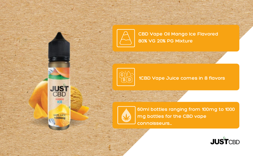 Your senses are in for a real treat – refreshing and calm is an understatement for this flavor! We know you’ll love our Mango Ice Vape Oil. We’ve perfected the sweet, fruity taste of mango followed by a cooling and icy sensation on the exhale. The healing, soothing effects of our top of the line CBD will be felt soon after, so sit back, relax and let your senses get carried away somewhere tropical with JustCBD Mango Ice Vape Oil. JustCBD Mango Ice Vape Oil comes in convenient 60ml bottles, and we offer different strengths of 100mg of CBD, 250mg of CBD, 500mg of CBD, or 1000mg of CBD, which is our most potent oil. JustCBD Mango Ice Vape Oil does not contain any tobacco and is made from only the purest of ingredients, just like all of our products at JustCBD. Remember, JustCBD Vape Oils are only for use in vaporizers, and not intended for ingestion.