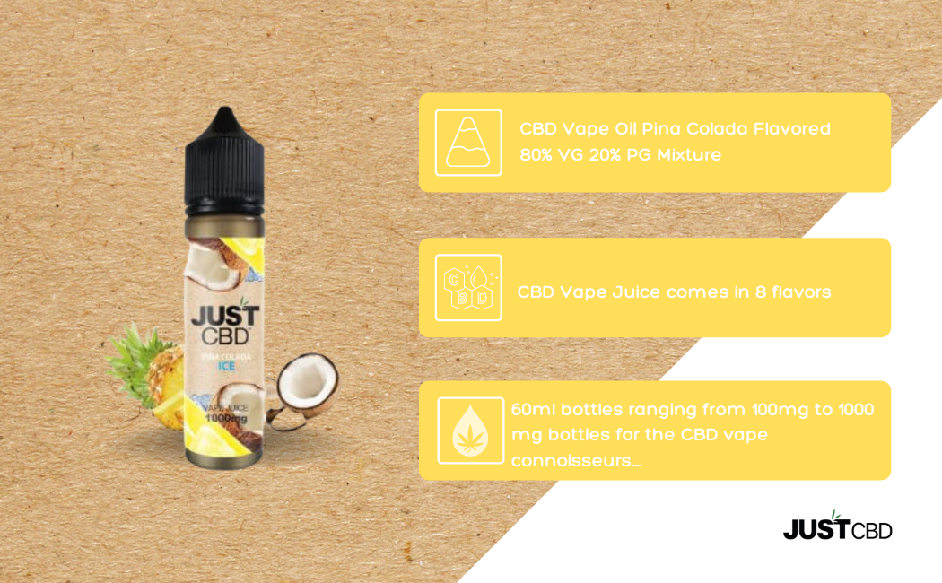 JustCBD Pina Colada Vape Oil will take you to your favorite sandy beach, with the warm sun on your skin and the exhilarating ocean breeze sweeping through your hair. Extravagant and sweet with a rum-flavored kick, our Pina Colada Vape Oil is not only remnant of your favorite tasty cocktail, but will give you that immediate ooze of CBD relaxation and calm. JustCBD Pina Colada Vape Oil comes in convenient 60ml bottles, and we offer different strengths of 100mg of CBD, 250mg of CBD, 500mg of CBD, or 1000mg of CBD, which is our most potent oil. JustCBD Pina Colada Vape Oil does not contain any tobacco and is made from only the purest of ingredients, just like all of our products at JustCBD. Remember, JustCBD Vape Oils are only for use in vaporizers, and not intended for ingestion.